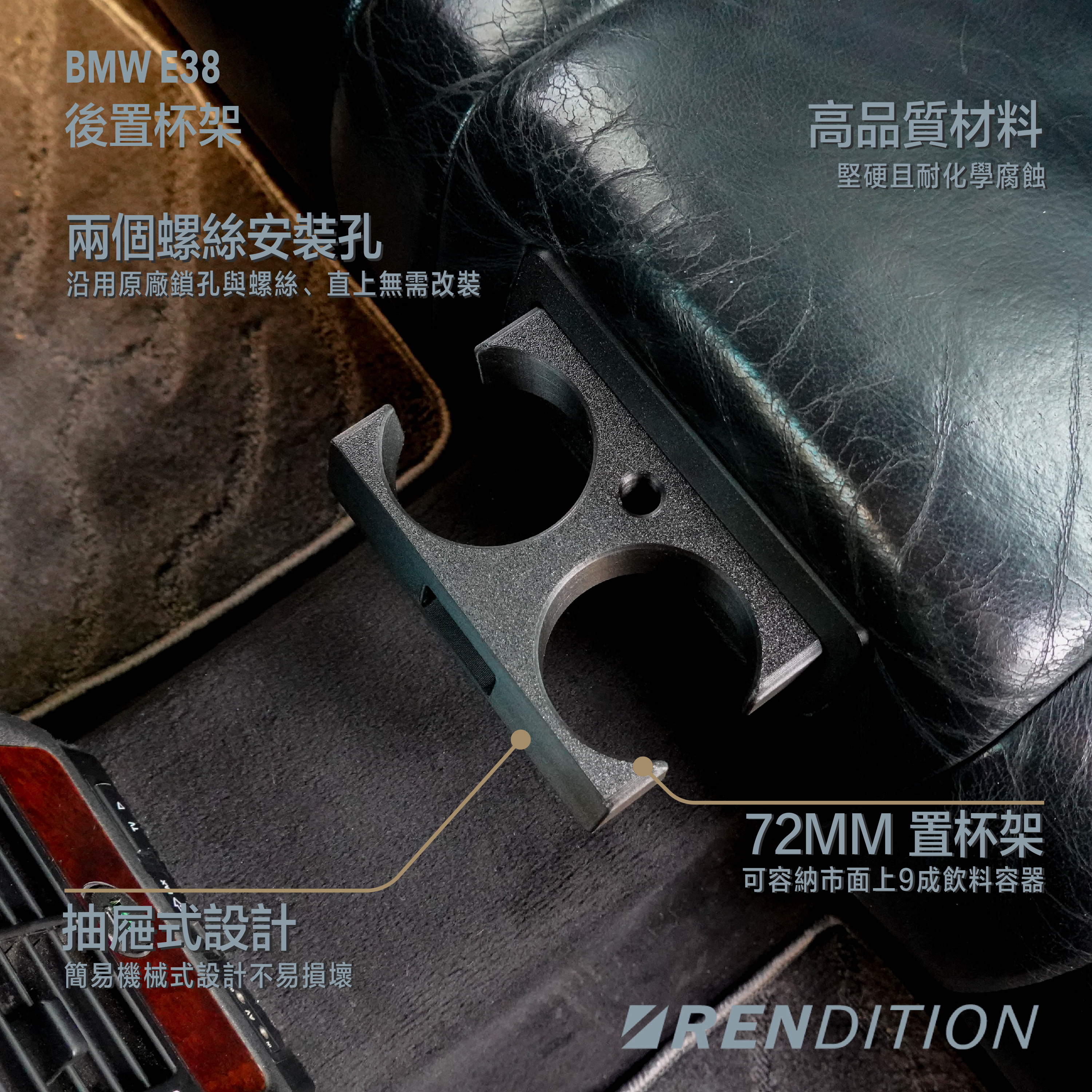 ● 3D掃描精密製造,完美取代 E38 原有後置杯架,利用原廠兩螺絲孔固定,穩固不晃動。