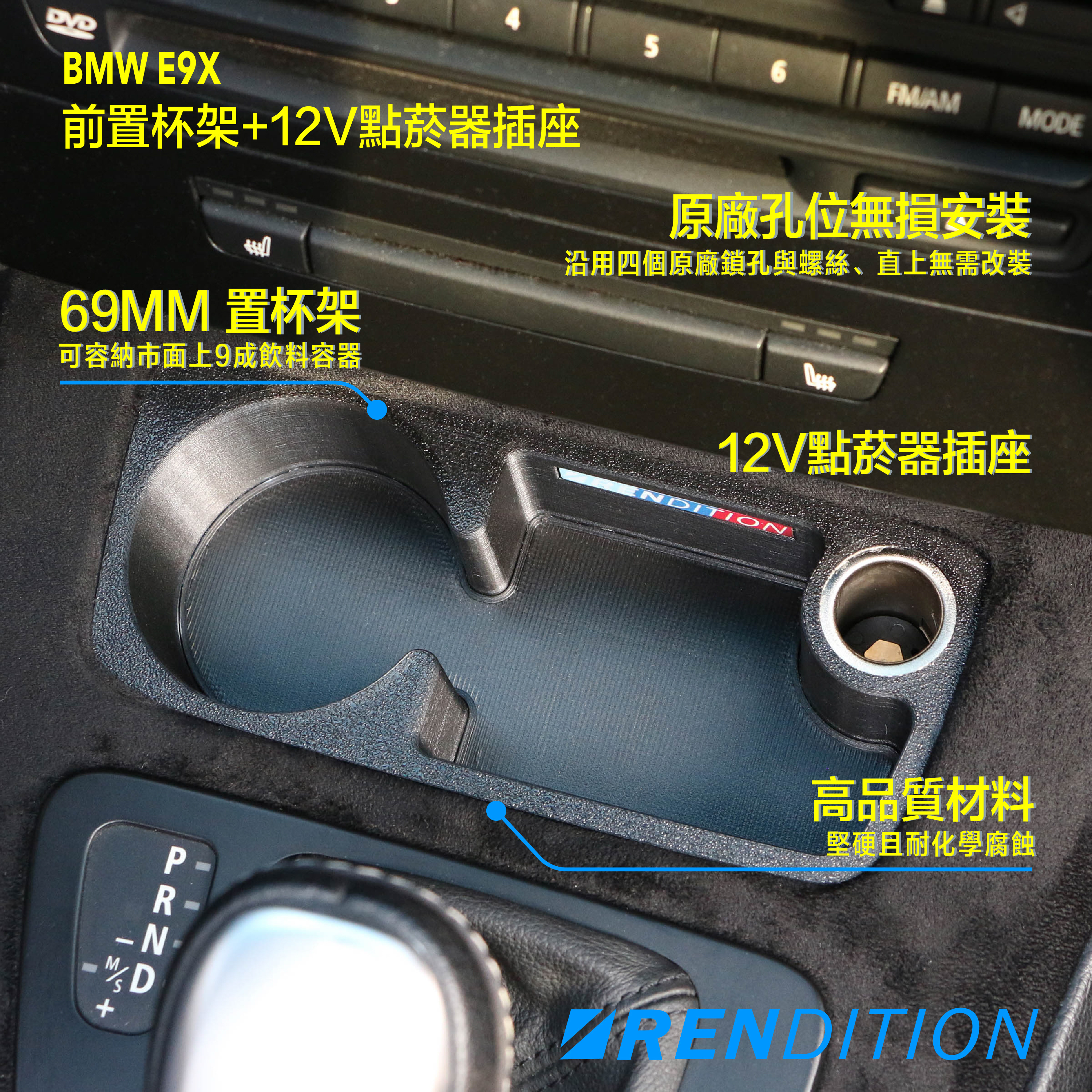 ● 專為 E9X 車系開發的完美前置杯架,現加入12V點菸器插座功能